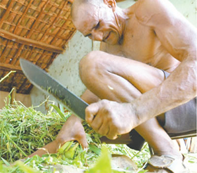 As mãos são certeiras no triturar dos galhos espinhosos. Os pedaços são pequenos, para levar a alimentação dos animais ao curral.